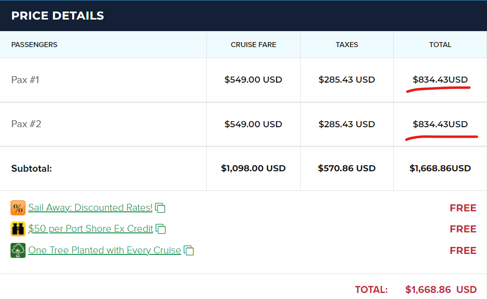 Below is the example of final price for two in interior cabin with all taxes and fees included ($1668 per cabin or $834 per person)
