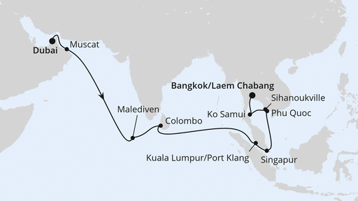 21-night cruise on AIDAstella sailing from Dubai to Bangkok visiting the Maldives, Sri Lanka, Singapore, Phu Quoc and other exotic destinations.