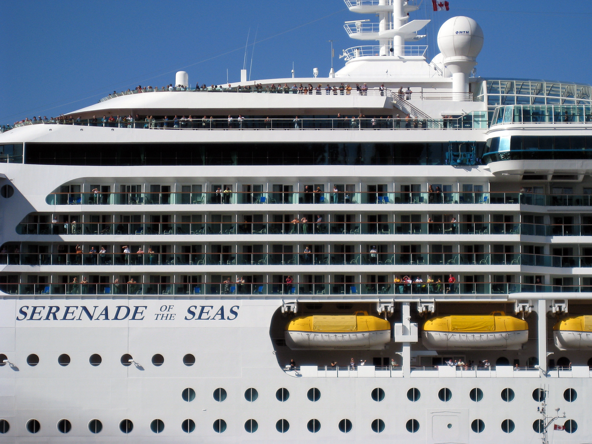 The cruise ship Serenade of the Seas of Royal Caribbean International was built in 2003 , belongs to the Radiance vessel series, and is 293 meters long with a displacement of 90,090 tons. The ship can accommodate up to 2580 passengers on board in 1075 cabins. The number of personnel on board is equal to 859 people.